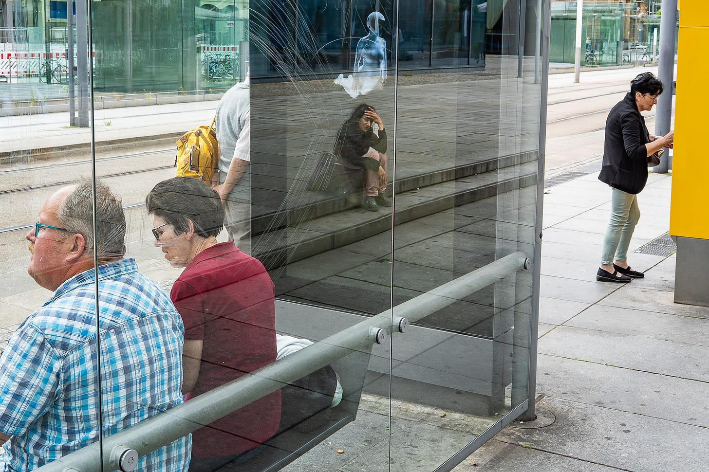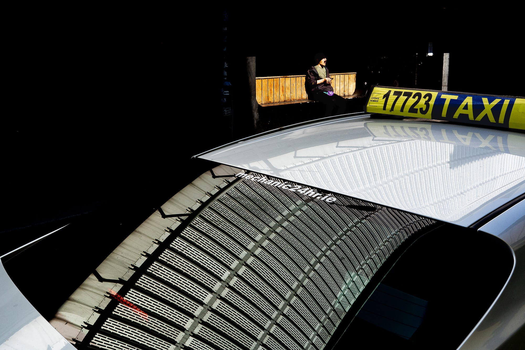 Another thing I learnt from a presentation by Matt Stuart in Luxemburg: What happens once often also happens a second time, stay on it! I first missed the yawning man in the shot from Dublin in this set. Saw it, lifted my camera… …and gone it was, no yawning, too late, just a sitting man in the light, boring. But then I stayed on that scene, waited for the next yawn – and here it was! In the meantime, a taxi had entered the scene and parked in my foreground, offering some great reflections of the building behind – sheer serendipity which comes to those who never give up and keep on waiting and walking.